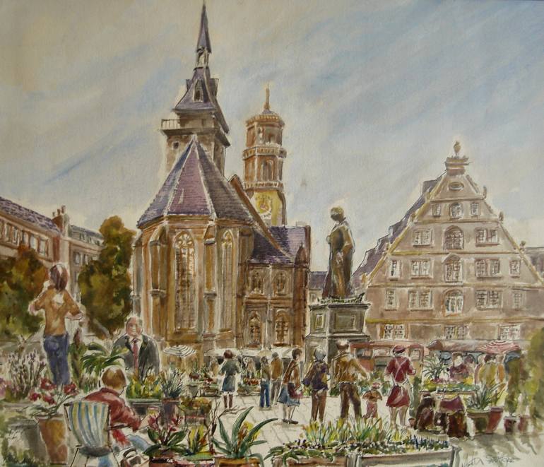 Watercolour painted from a drawing I did while working in Germany.This is Schiller Plz in Stuttgart,the Flower market happens occasionally the two towers are on the same church the far tower has a gold clock face and date of 1609 around it.On the corner is a Museum and across the road is fantastic ...
