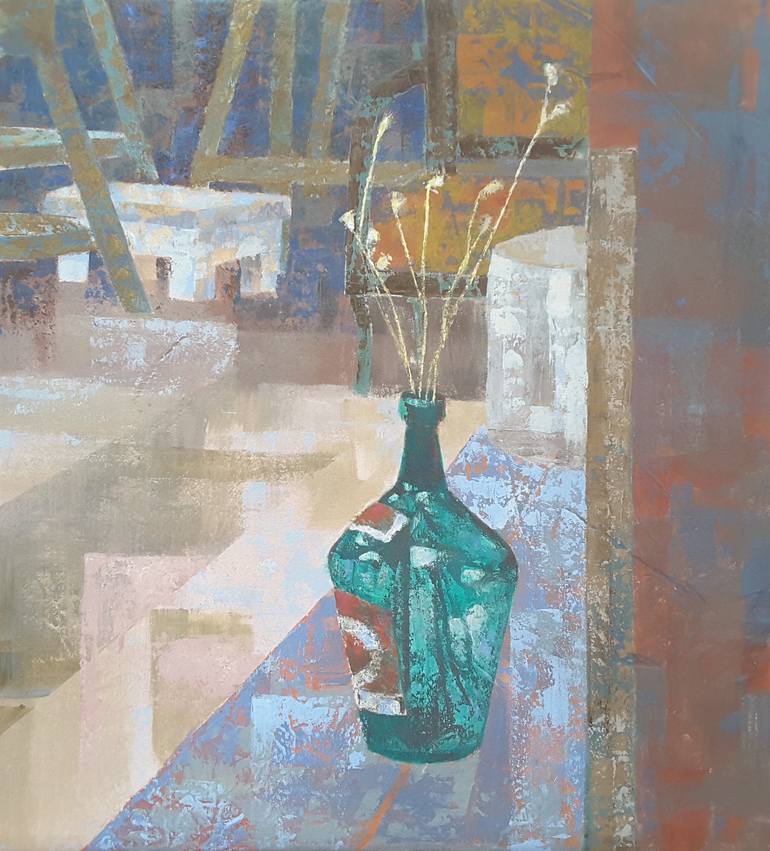 An old bottle with dry flowers in the studio. Painted on a rough textured canvas. The picture has a 5cm margin to help stretch the canvas on a wooden frame. Ships rolled in a tube.