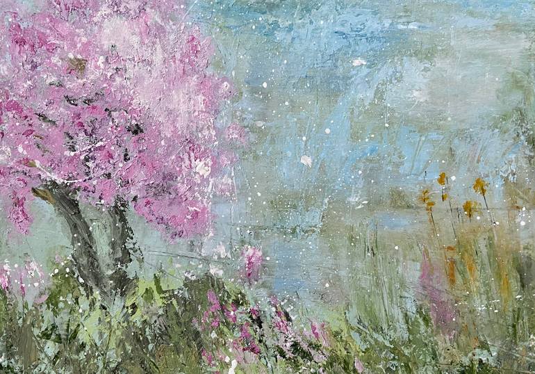Painted entirely from intuition, spring/summer trees in bloom. On multi-media board mounted on wood panel and framed. Signed and dated on the back.