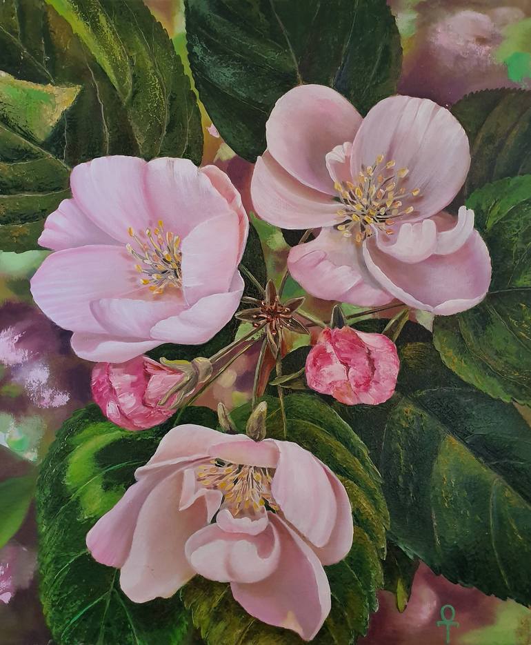 I painted this picture from nature. An apple tree grows near my house and every spring it is covered with a white-pink cloud of flowers with a delicate aroma. For the convenience of working on it, I chose a canvas on cardboard and oil paints. I worked for several days, admiring its magnificent flo...