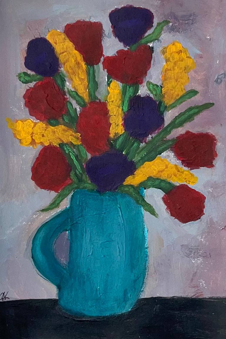 Small Acrylic Painting of flowers in a water jug. With a small border around the edge. Colours may differ on screen as opposed to the physical painting