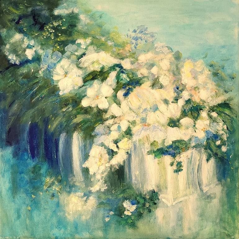 Work in the 'Theme of Florals & Garden'. Acrylics/waterbased oils on wood-stretched canvas. Signature on the back. Certificate of Authenticity enclosed. Ready to hang directly from unpacking. The use of a restricted palette of blue, green and white shades is creating a relaxed atmosphere in your ho...