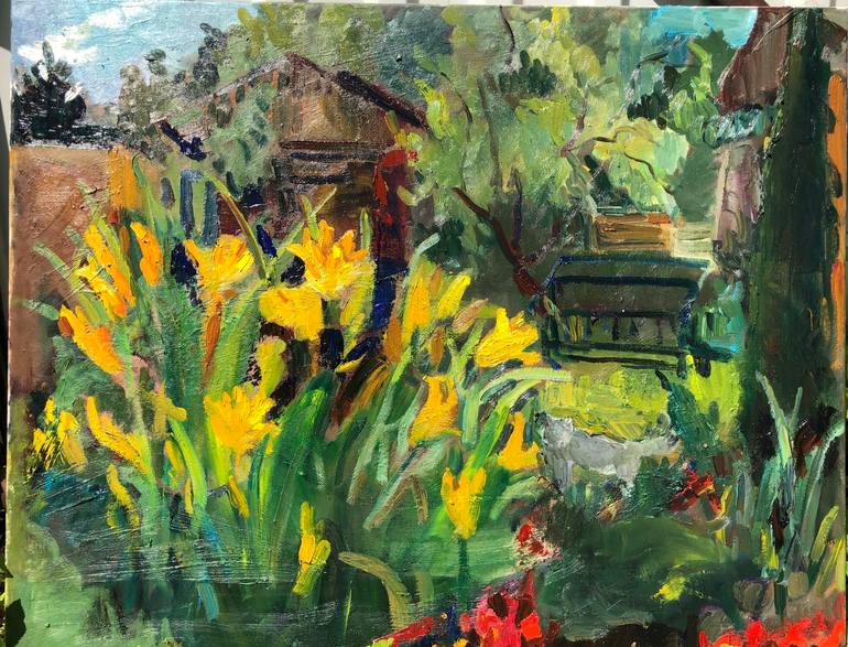 yellow flowers in the garden are painted in oil in the evening. Textured painting is done on fine-grained canvas. The painting was painted with a palette knife, bristle. the painting consists of a large smear.