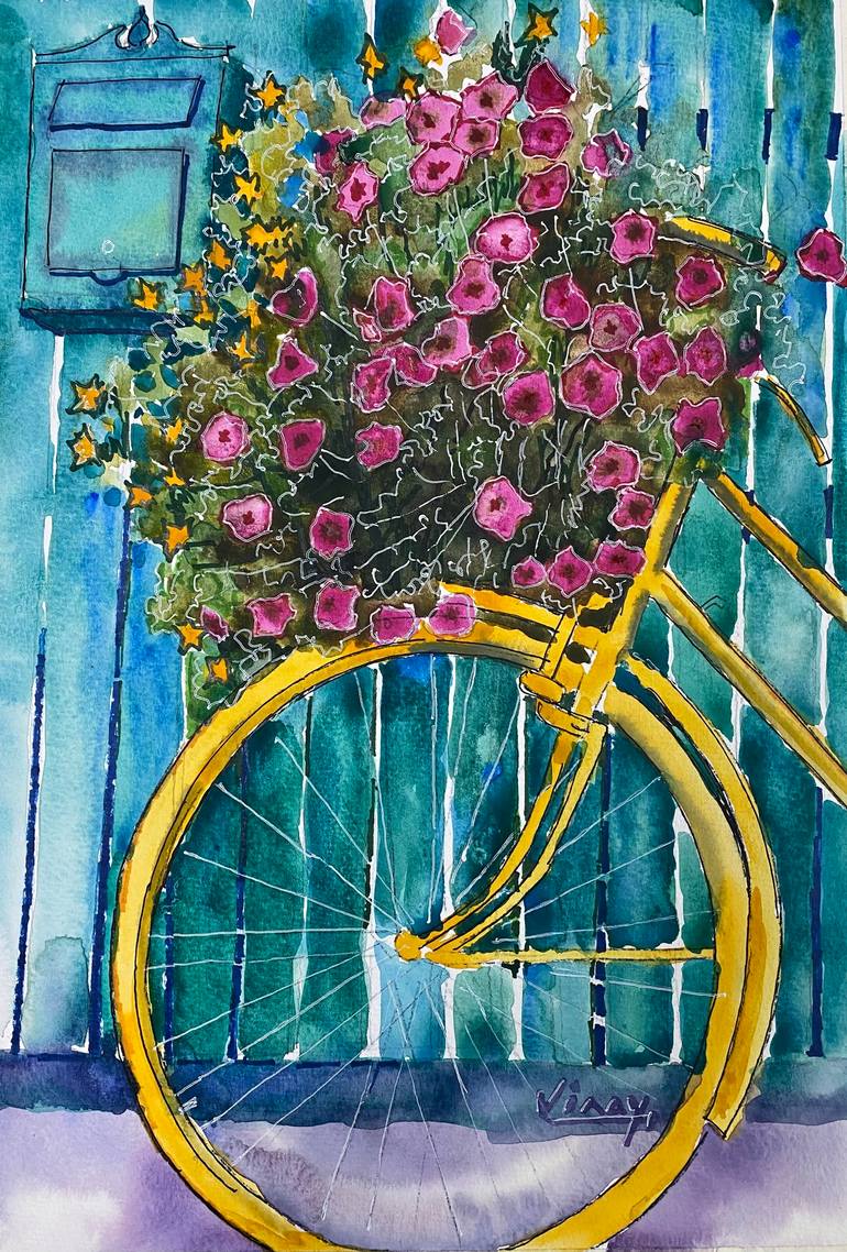 The lovely purple cone flowers in bouquet so dense.... Standing out against the turquoise picket fence. Perched atop my cute yellow tandem... are yearning for your fandom ! Vinay Babar