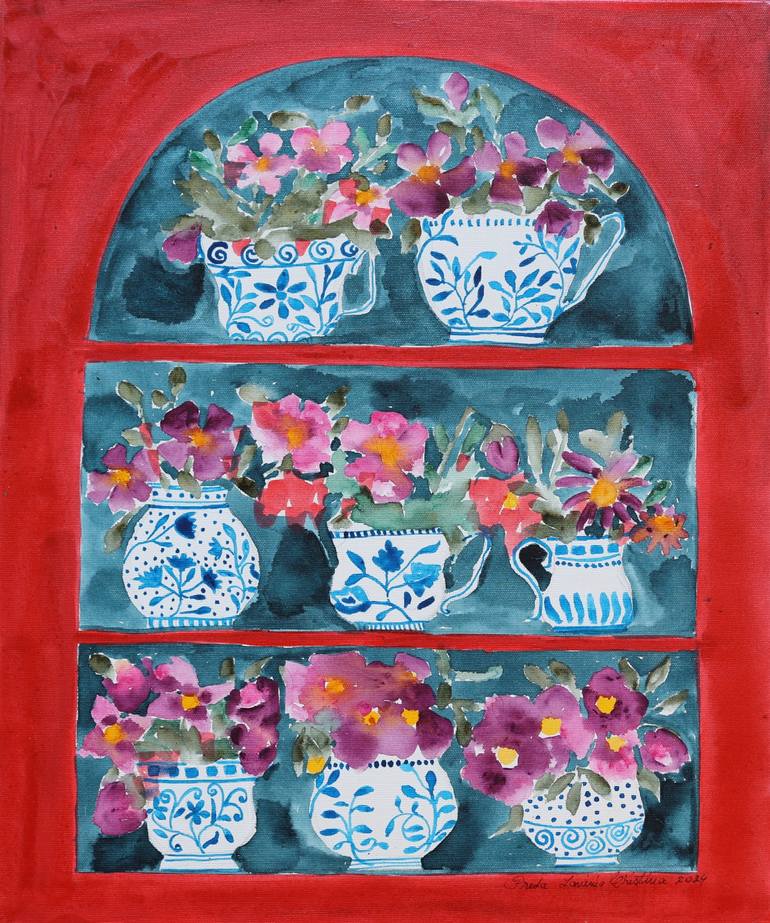 The work is of traditional inspiration. Romanian ceramics full of flowers from the royal house on the shelves