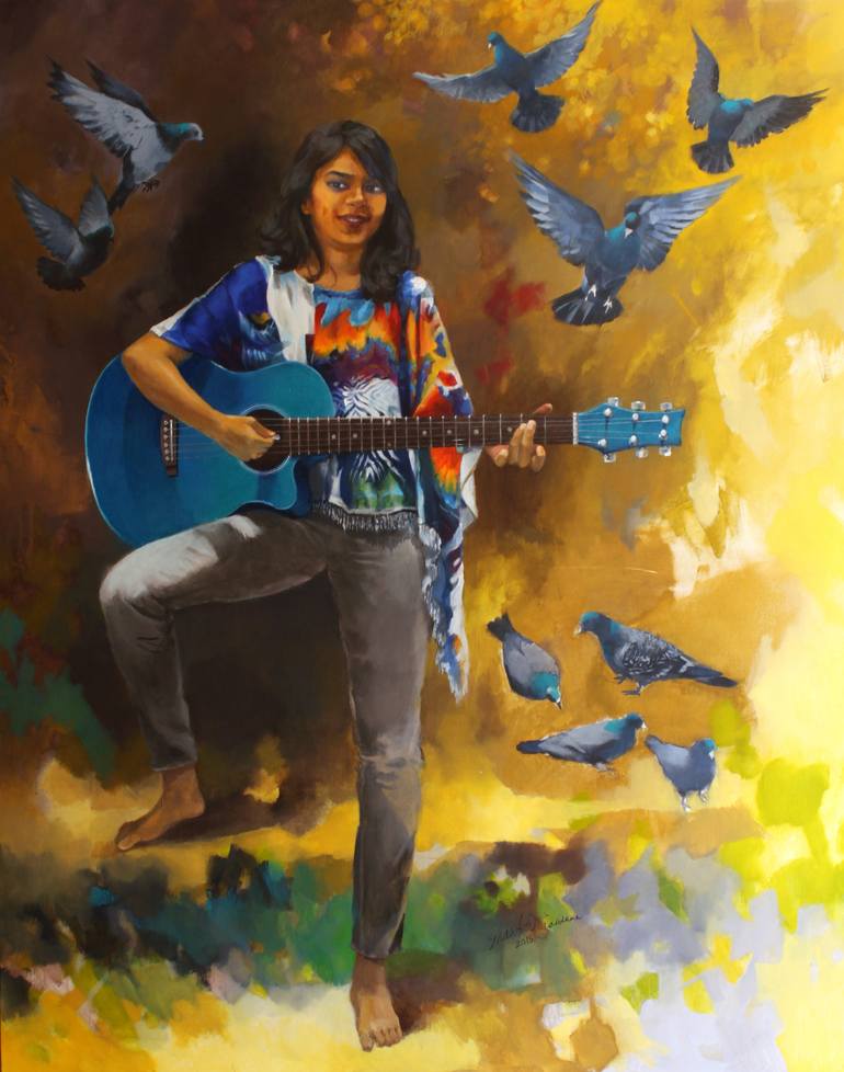 Musician, playing guitar surrounded by Pigeons. Free flowing abstract background. Musician is trying to connect with the nature spiritually.