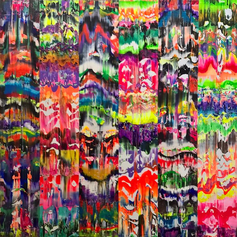 The title Flux refers to the fluidity and movement of the paint and the way it changes as viewed. The paint is a mixture of pure and mixed colours, metallic and fluorescent which vibrate and contradict in harmony and disharmony yet overall form a unified image. The paint is dragged and poured in ban...