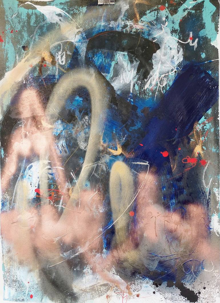 Saja Davidsdottir is raised and born in Iceland and has roots that connect with Scotland and England. Saja currently lives in a small town that is bubbling with geothermal power and nature. She is inspired by the rugged nature and urban energy of the planets cities. Mixing organic shapes, personal memories, experiences, politics and street vibes create her mixed media works. The flow of body and mind with various materials build up her powerful artworks. Saja studied textiles and concentrated on silkscreen printing and free fabric painting working independently, with designers and companies alike. In recent years Saja has enjoyed exploring painting and the free flowing experiments.