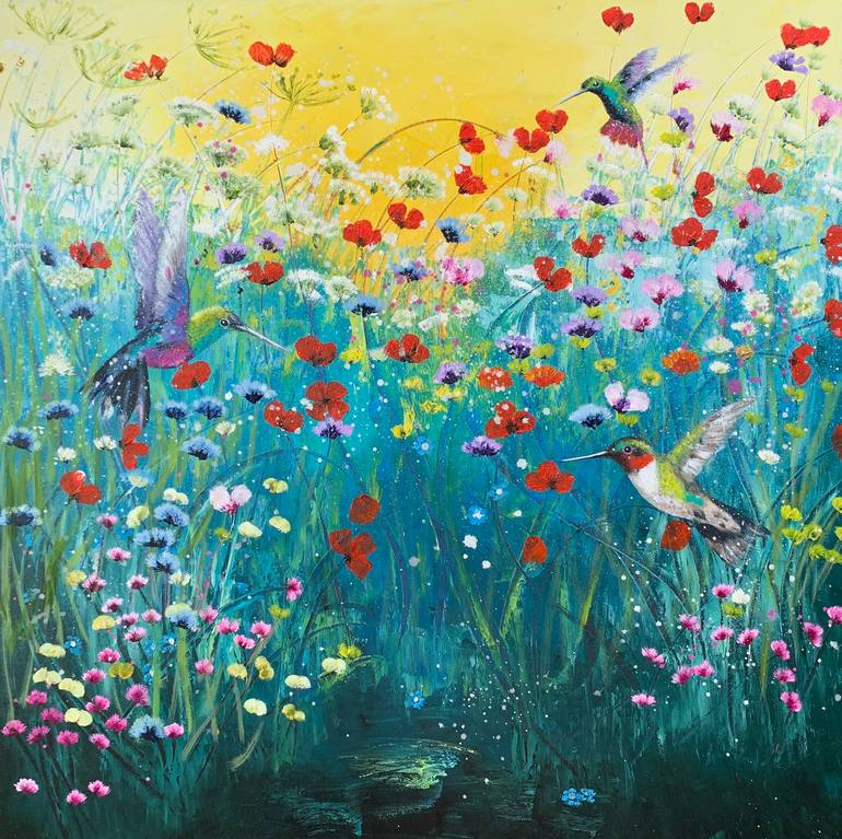“In creating this vibrant tapestry of nature, I sought to capture the effervescent spirit of a blooming meadow under a warm, golden sky. Through expressive brush strokes and a rich palette of oil paints, I embodied the playful dance of hummingbirds amidst wildflowers. This artwork is an ode to the f...