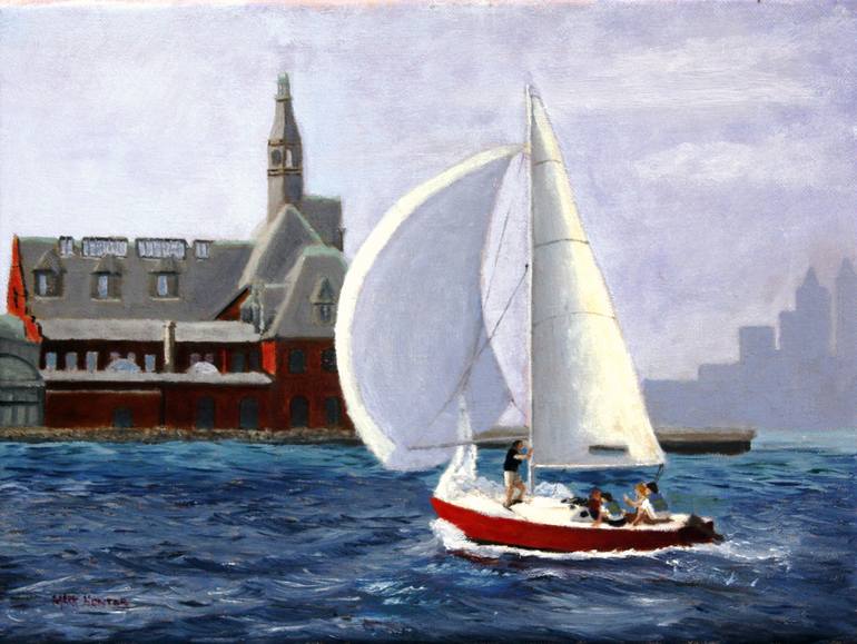 This work was inspired by the time I was a member of the Manhattan Sailing Club. The Club owns a fleet of J24 racing sailboats that its members can sail on the Hudson River in New York Harbor. This painting depicts a J24 sailboat flying a spinnaker during a typical evening regatta.