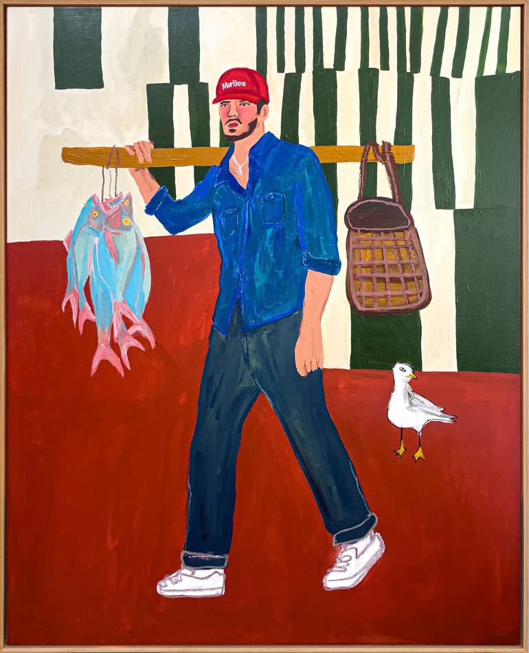 For the Table captures a moment of quiet pride — a man returning from the water, fish slung over one shoulder, a woven basket hanging from the other. He’s dressed in denim and sneakers, a Marlboro-red cap pulled low, walking not just through space but through time — half-modern, half-mythic. A seagu...