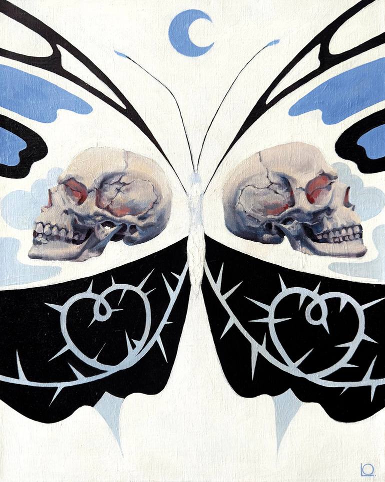 The painting ‘Prediction’ depicts a butterfly with skulls and thorns on its wings. It is painted in black, white and blue. This work explores the themes of life and death, emphasising fragility and transformation. The butterfly symbolises transition, and the skulls are a reminder of the transience o...