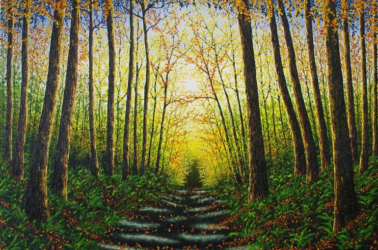 An impressionistic oil painting of a deep dark forest path, on a late afternoon in the season of autumn. Where the sun is starting to go down in the forest sky there has been reflections of golden light shining through the canopy, creating startling shades of greens, and various hues of golden yello...
