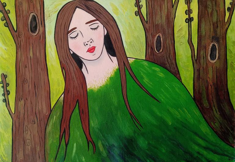 Original oil painting on canvas, of a surreal portrait of a woman in an illustrative style.