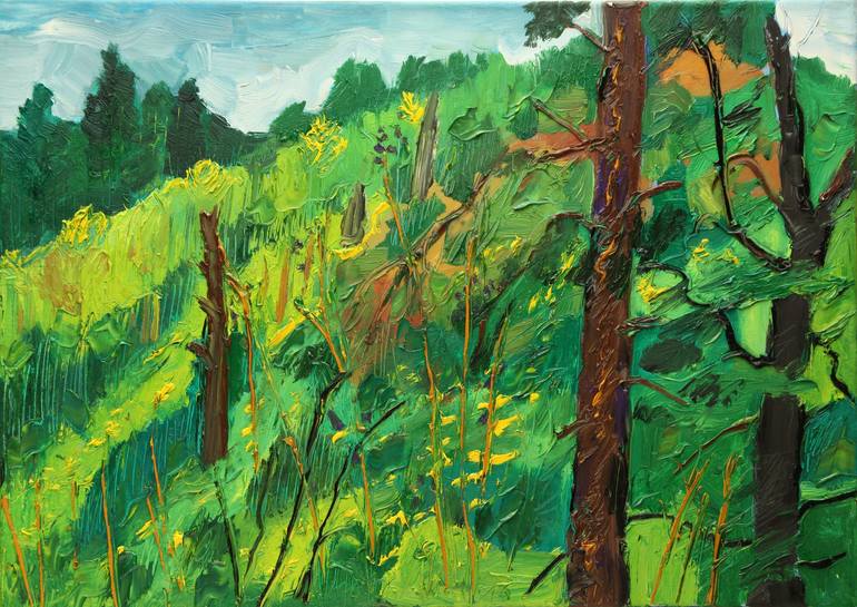 "Forest on the slope" captures the essence of a vibrant summer spent in Bad Berleburg, Germany. This original oil painting on canvas is a testament to a period of intense creativity, where each day brought new inspiration and refinement. The expressionistic style beautifully conveys the energy and e...