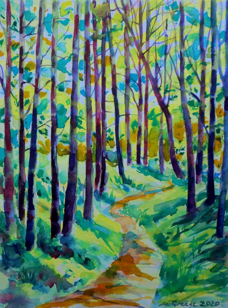 Forest path XVII, 2020. There is something intriguing about the road that curves up and fades in the distance. It is a moment of expectation and hope to what is lying beyond the unknown. Another impressionistic image of a path in the forest, with Sun breaking through the tree tops and dark shadows c...