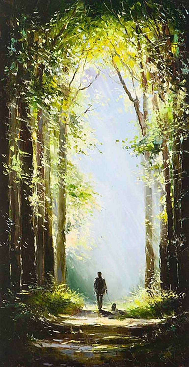 A canopy of trees form the perfect hideaway in this scenic take of a hidden forest. As the trees, carve out a shady walkway, the artist captures a moment stolen with Man's greatest companion. Walking side by side, here is a piece of art that reminisces on, and celebrates the true meaning of friends...