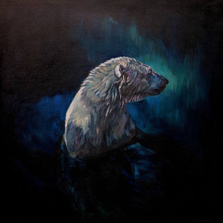 Christine Montague is an award-winning realism painter who creates beautiful, haunting and inspiring paintings about the iconic polar bear and its vulnerability to climate change. For the past decade she has used her skills (BFA, BSc.) to create realistic portraits of this highly intelligent, powerful apex predator against backgrounds symbolic to the threat it is under. Colour, canvas and various aesthetics symbolize wonder, hope and warning. Christine's polar bear paintings are in collections worldwide. Christine accepts custom and portraiture painting commissions, She is based in Burlington, Ontario, Canada. More about Christine Montague - When polar bears were listed on the Species At Risk Act, Montague began her passionate journey of painting polar bears. She uses her portraiture and realism oil painting skills, to document and celebrate the polar bear's character and spirit, its high intelligence (think great ape), and its survival in a world of vanishing sea ice. Through her travels to the Canadian arctic (Iqaluit & Cape Dorset, Nunavut) and subarctic (Churchill,Manitoba, Canada - polar bear capital of the world), Montague has furthered her knowledge on polar bears and climate change. In September 2017, "Dark Water 1", a painting of a polar bear in an unfrozen sea, took top award at the Canada wide Canadian National Exhibition Juried Show. “Dark Water”, Montague’s solo show of polar bears and climate change was exhibited at Toronto's Artworld Fine Art Gallery March - April 2018. (now Donna Child Galley) "on thin ice" is the name of Montague's solo show (Jan. 2 - March 1, 2020) at the Montgomery's Inn Museum, in Toronto, Ontario. In 2023, her 3rd polar bear solo show "Polar Bear Wonder and Warning" took place at the Fireside Gallery at Art Gallery of Burlington, Burlington, ON. Montague’s painting’s have been in over 80 art shows, and are award winning. Her work can be found in collections in Canada, U.S.A., the Netherlands, Denmark, Great Britain, New Zealand, and Australia.