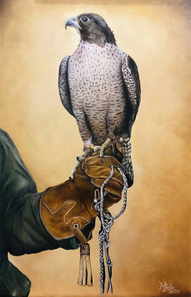 This painting was created in 2021 as a way of expressing the importance of culture in the Arab world, which took about 50 hours, is realistically painted with oil paints Why does the falcon wear glove? These gloves are used by handlers to turn the arm into a suitable perching surface for the bird w...