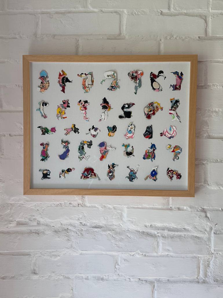 For this piece I used my palette. There were several kind of colors building layer by layer on the palette. When all the paint was dried I cut throughout the layers, then got these small funny looking (cartoon figures featured) fantasy creatures. Each of them are some kind of animals, aliens, whatev...
