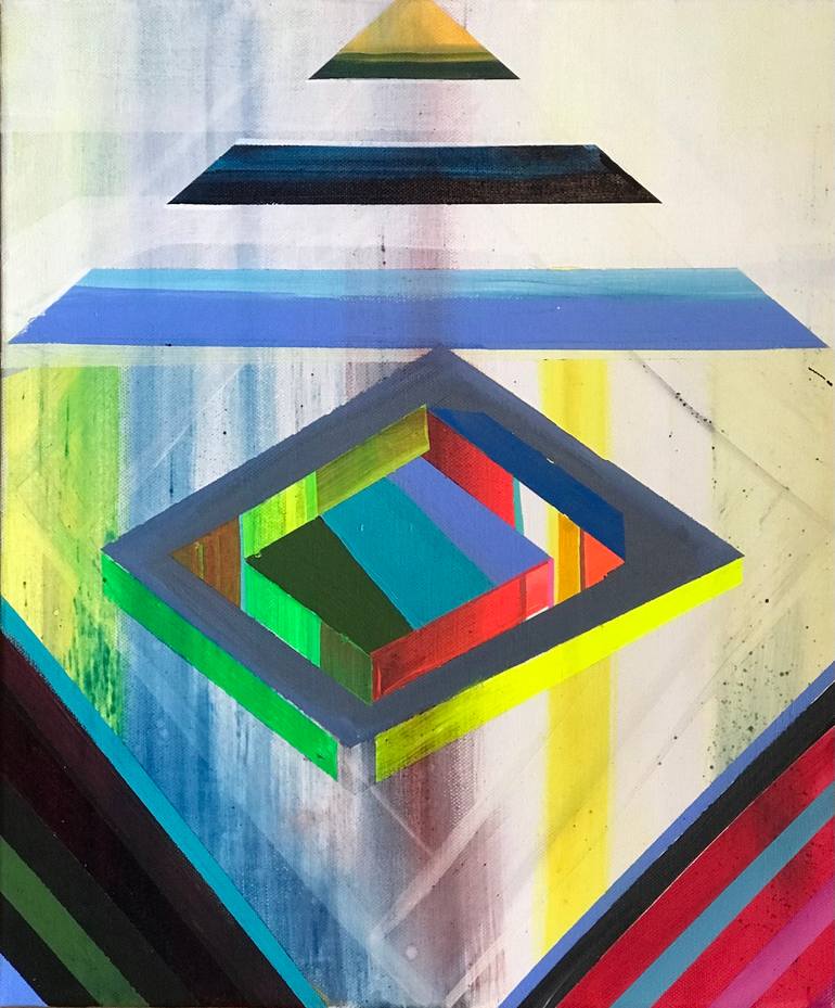 This work is guided by a somewhat lengthy contemplative focus, mostly driven by interior influence, less so by normal exteriors(nature, urban, architecture, etc..). The forms, color, linearity, composition, and illusionistic space are more elements of vocabulary I use in this case. The forms might...