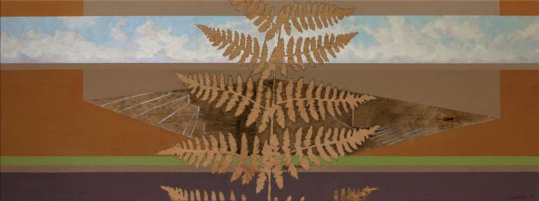 This is one of the first paintings I have where the bands of colors appear. The natural geometric pattern of the fern responds to that of the bands. All in a panoramic and aerial vision that opens the space like in a cinemascope. There is a duality between the stairs that go down where we do not kno...