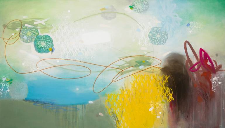 This abstract painting is inspired by nature, especially clouds and gardens. Terri Dilling's art makes reference to the landscape around her but also an emotional landscape within. The duality of interior/exterior realms gives the work a depth of meaning. She uses gestural marks and color relationsh...