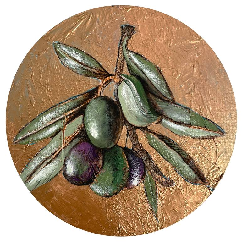 A vivid composition where a single olive branch becomes both subject and symbol. The ripe green olives and slender silvery leaves are rendered with sculptural clarity, suspended against a luminous Andalusian blue — a color that evokes the wide skies and painted doors of southern villages, sun-faded ...
