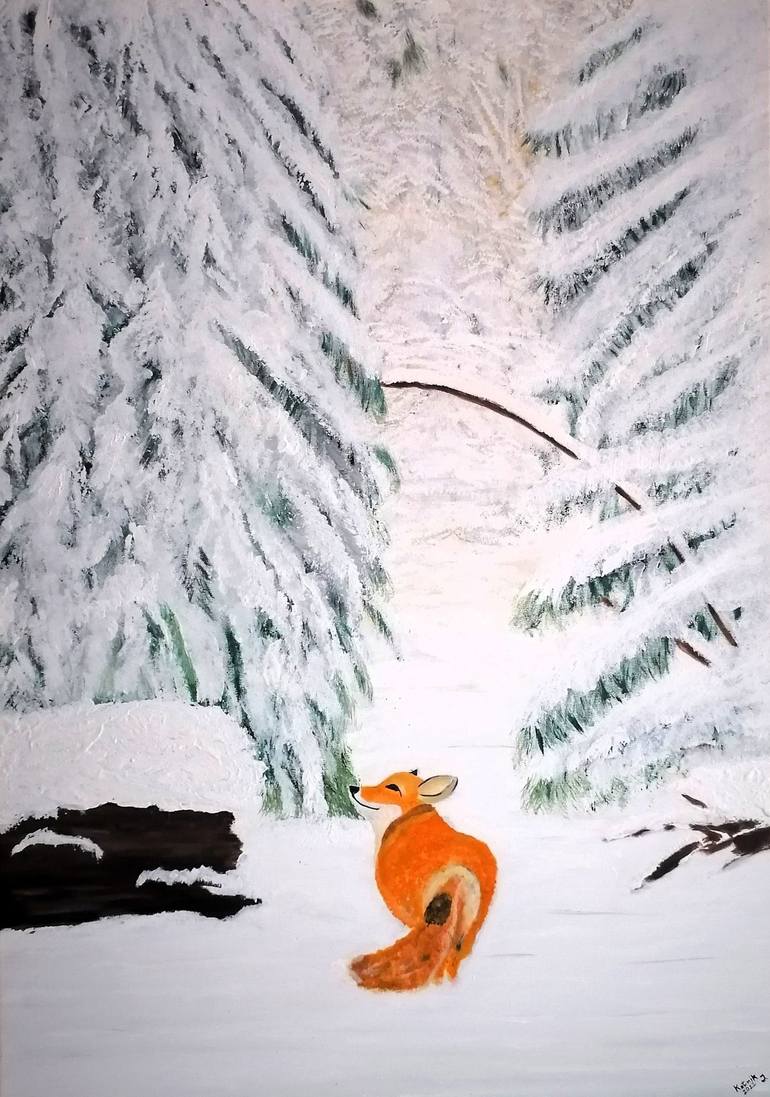 Acrylic on canvas "Fox in the snow" 70x100cm year 2023 original signed front and back. It is made on high-quality cotton canvas with dimensions of 70x100 cm. The artwork is protected with a high-quality varnish for long-lasting color freshness. It is signed on the front and back. It is ready to hang...