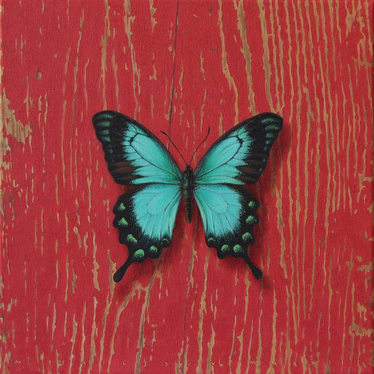 The theme of fragility and the ephemerality of life and things was a good ground to initiate this series of paintings with butterflies. I experimented with complementary color contrasts and I opposed warm, organic, and velvety textures with rough, chipped, and sharp surfaces.