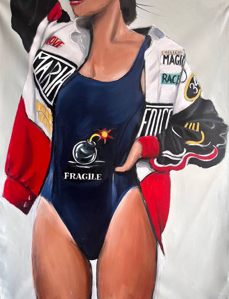 Maria Folger is a photorealist painter who lives in Los Angeles. She uses acrylic and oil paint to create portraits of women, playing on sexuality and femininity. Maria often depicts lingerie-clad beauties, vampy red lips, and patent heels but juxtaposes these subjects with pizza slices and pineapples, adding a humorous tone to some of her sensual works.