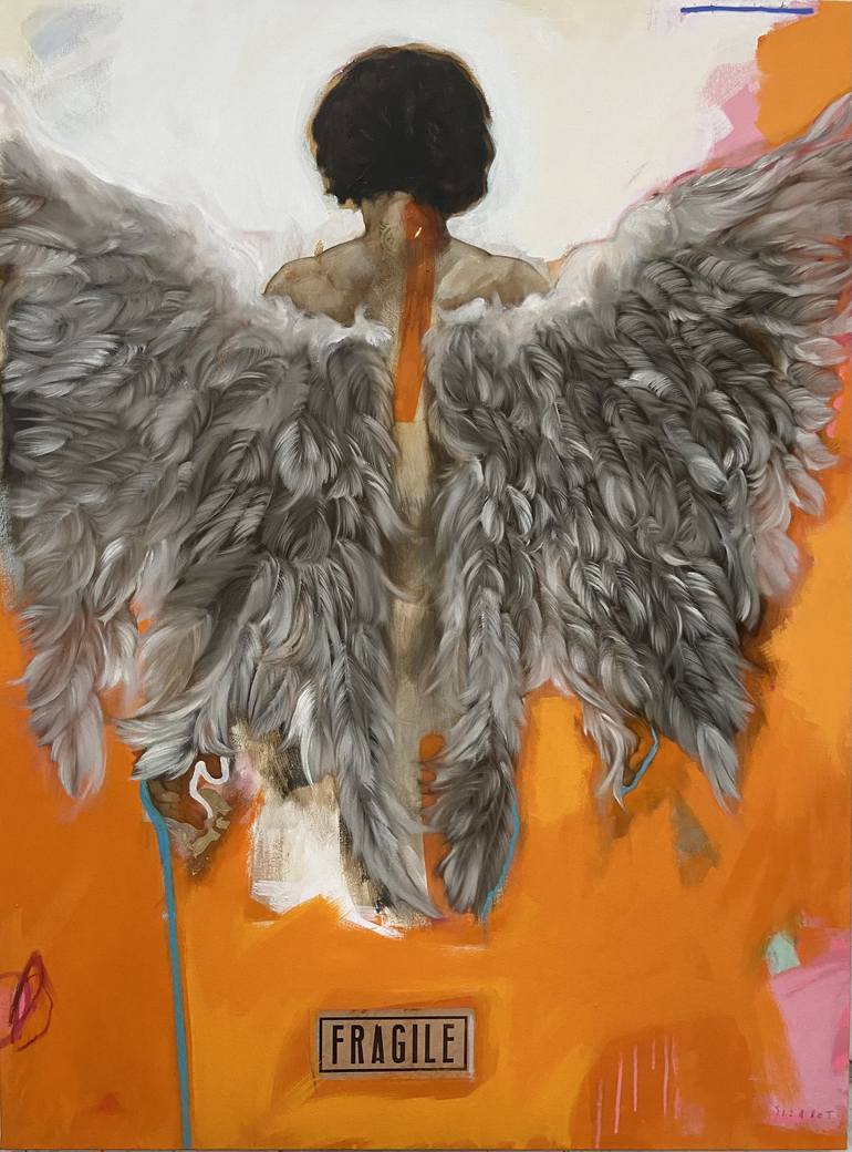 With this painting the artist suggests the lightness and fragility of being. The feathers symbolize this fragility. The wings here are more an adornment than a possibility of flight. The winged character seems to walk forward.