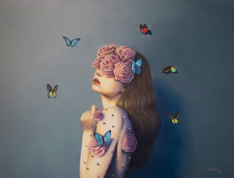 Women as symbolic universes that contain the strength and fierceness of life. Andrea Nanì was born in Modica(1993), Sicily, and since he was very young he deeply loved drawing, so much so that he dedicated every moment of his free time to it. During his art history studies he was deeply impressed by surrealism and began to experiment with graphite pencil and pastel colors looking for a different representation of reality, one that is capable of realistically and analytically portray subjects like the hyperrealism but at the same time is able to represent emotions and life experiences through signs and symbols. He began to exhibit his art in 2015 at the “Ritratti” art show that was hosted in Rome at the “complesso dei Dioscuri”, after the first exhibition more followed, a few of the most important ones include the first personal one in Modica in 2017 and also “Omaggio a Frida” in 2019 that was hosted both at Eskimo in Florence and at the Italian cultural institute in Mexico City; in 2020 he displayed his art in Venezia-Mestre at the “Centro Culturale Candiani” as a Finalist of the Mestre pittura contest and during the same year he won the “#xppenvlogchallenge” competition in Japan. In 2021 he got fifth place in the “premio internazionale Michelangelo Buonarroti”. Andrea Nanì’s art main theme is women, their extraordinary expressivity, their unique combination of strength and frailty, their courage in facing hardships, and sometimes even the pain of violence and abuse. The artist’s works are not simple portraits but instead they should be considered almost like allegoric images with a unique theme that is very close to surrealism and magic realism, in which magic elements blend perfectly with the realistic subject of the painting. The artist’s technique portrays the woman close-up with a photographic focus on the face and bust, because they are the best at representing the subject’s soul through the features of the face and marks of past experiences on the body, in which symbols flourish and new spaces open. Some paintings are rich of multiple symbols like wings too small to fly, body parts that change into intense and delicate flowers which can be crushed in an instant, scars that everyone tries to mend but they still leave a permanent mark, or that sometimes can be healed by symbolically putting together pieces of yourself with gold dust lacquer.
