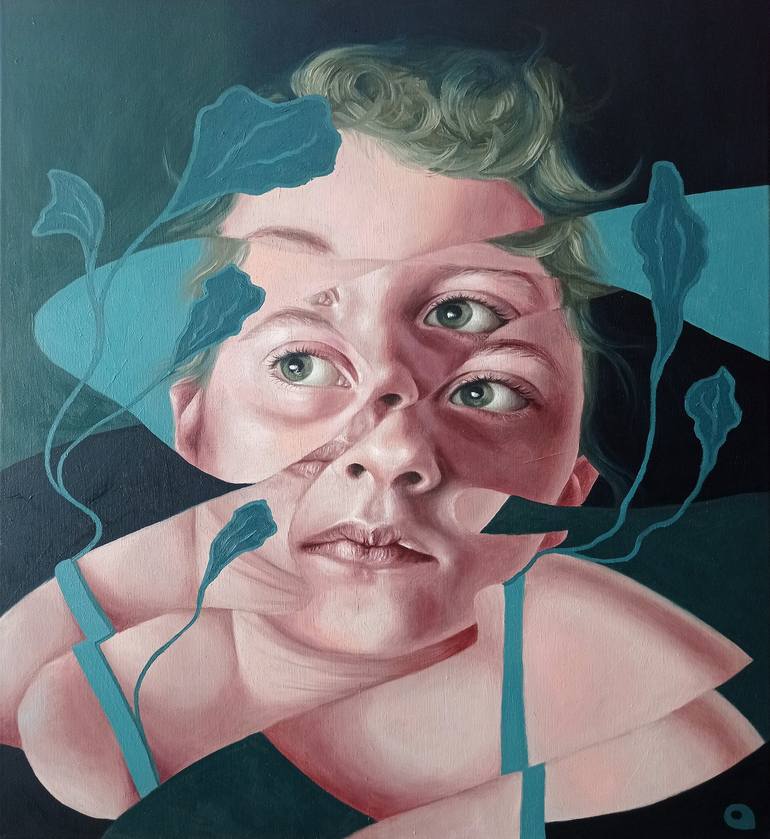In this portrait from my Fragmented series I am experimenting with illustrative flat elements that add another dimension to the traditional oil painting. I chose to paint the portrait fragmented because I realised that we are born whole, but are starting to fragment as time passes, almost like get...