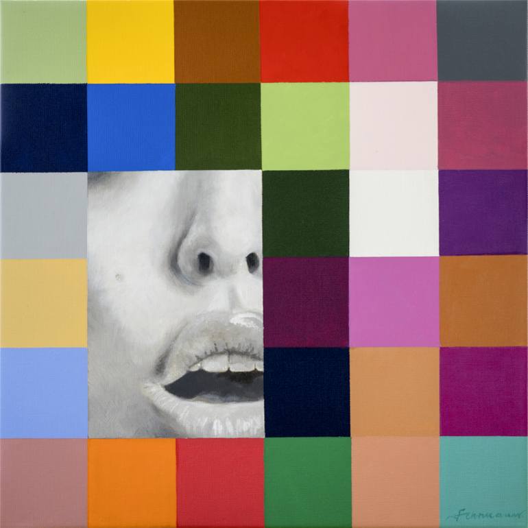 Square colored pixels fragment the black and white face of a young woman. The work is signed on the front and back and has a numbered certificate of authenticity. The sides of the picture are painted, hanging without frame is possible. Oil and acrylic colours were used. The painting has been carefu...