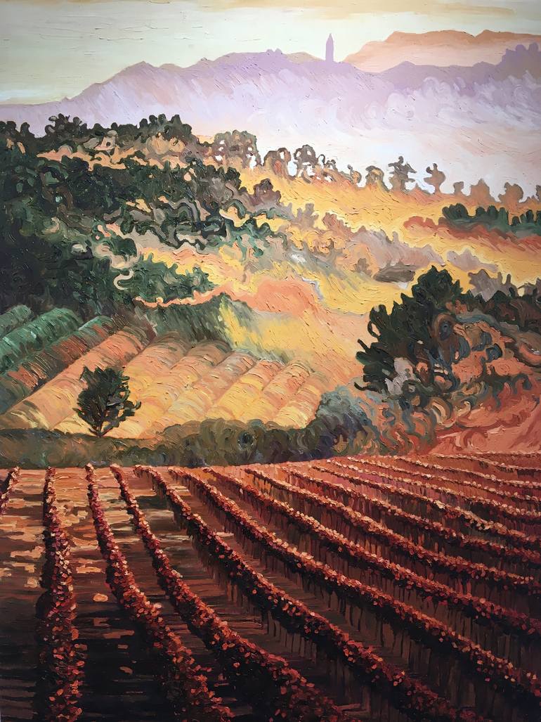 Vines, rolling hills, mist over the river and sunset together make this composition, created by me in my studio in South France. Oil on linen canvas, shipped rolled, stretches and hooks all packed together with the painting as A KIT.