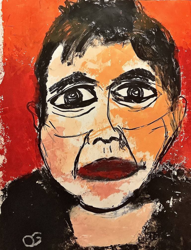 acrylic, marker on acid free 98lb sketchbook paper Part of a series of portraits inspired by images of other artists from social media sources painted in a raw expressionist style using palette knife and brushes. Signed on verso; initialed on front; unframed. Part of