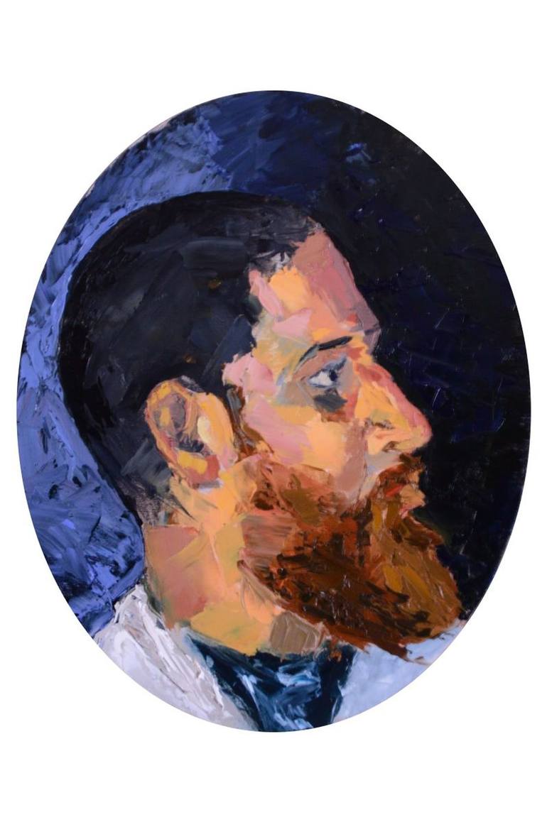 A quick oil sketch I made of my friend, Francisco, while he himself was painting something. Since he was moving all the time, it was a great training for my visual memory. It's all done with the pallete knife, with rich impastos, on an oval stretched canvas.