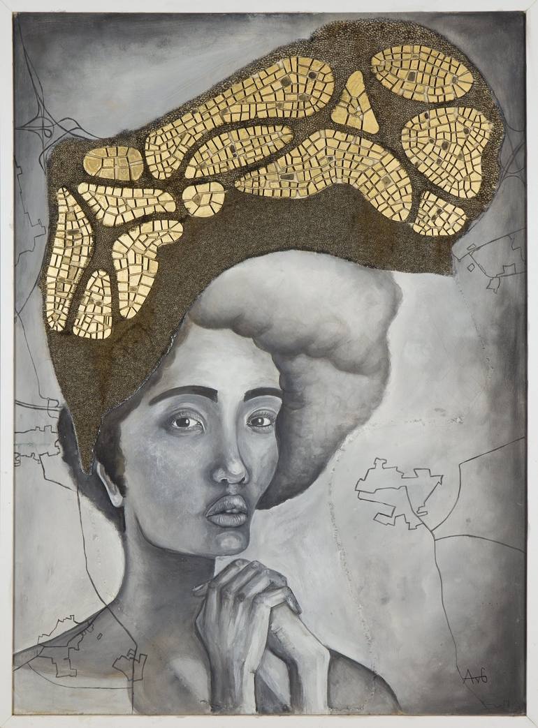 The artwork was originally an architecture project, a plan for a settlement. I used the shape of the settlement plan as a headdress and painted a strong, confident woman with a profound gaze. She embodies the symbol of a modern woman—strong, self-determined, and just perfect how she is.
