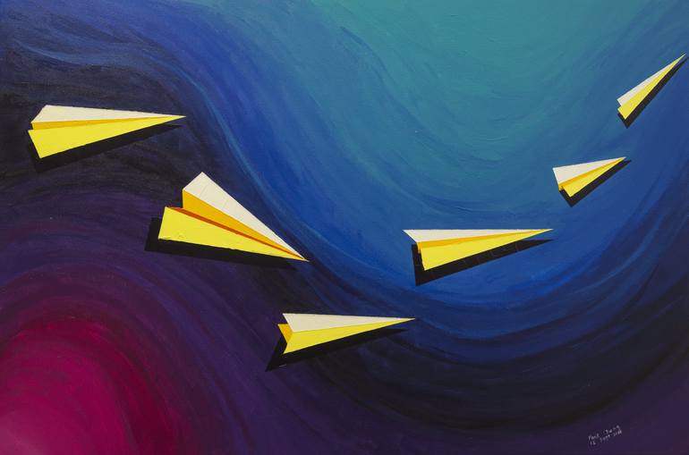 Title: Free Flight Size: 23.6 x 35.4 Inch (60 x 90 cm) About This Painting: This is a simple painting subject of paper planes flying in one direction with colorful background. To express joy, freedom, colorful moment of life and cheerful atmosphere. Detail Descriptions: 1. This painting is create...