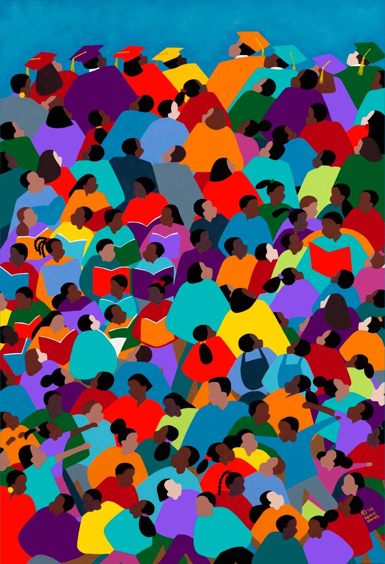This painting was commissioned by Freedom School Long Beach to be used as their signature painting and for fundraising via the sales of reproductions. Happy as reflected by the children in the painting.