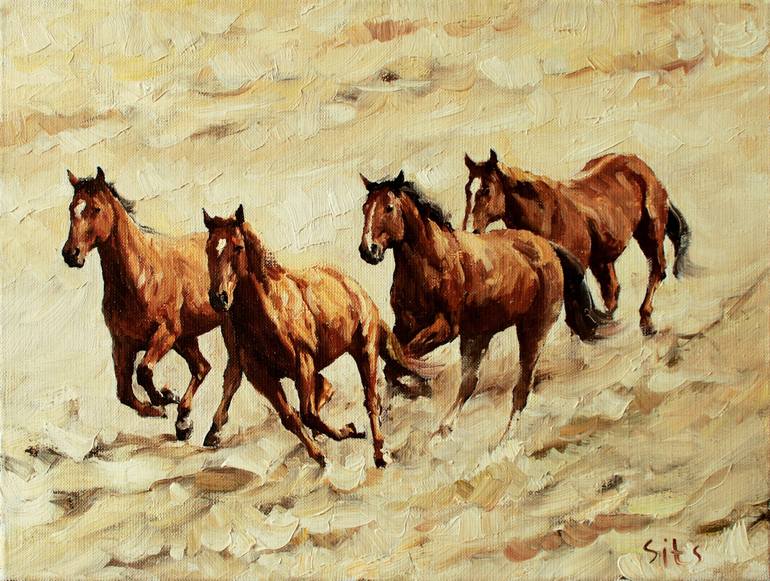 Modern, expressive landscape. Running, speed, wind, inner freedom. It's all about horses. Sometimes you want to feel as free and light as the wind. It is painted on a professional canvas with high quality oil paints and varnished to protect against UV light, and dust. The painting is framed. The si...