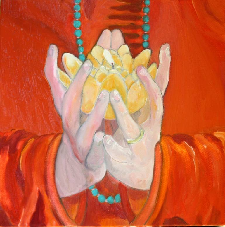 "With Love and Gratitude. Hands in lotus position holding a lotus candle. There is a gold ring on the left ring finger. The flame moves from left to right, from the heart, out into the world. Turquoise prayer beads are worn from the navel point up to the back of the throat on top of a red robe. Exc...