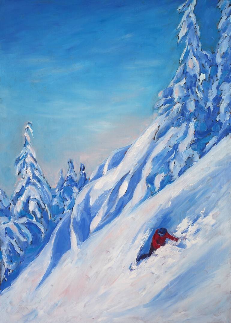 Title: Freeride Oil painting, Canvas Executed: 2021 Cm: 50w/70h/2d Inch: 19.7w/27.6h/0.8d * This artwork is 100% hand painted using quality oil paint. * This work is unique, this is not a print or other type of copy. * Ready to hang. Canvas will be sent on a wooden stretcher, and the sides are pa...