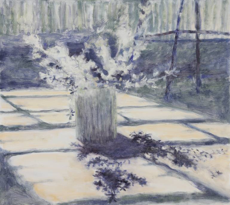 This oil painting is part of the artist's California fire trail series. The flowers in the tin vase are from the invasive (but beautiful) French broom plants scattered across the California foothills near the artist's studio. The bouquet sits on the cement floor of the artist's studio, framed by sha...