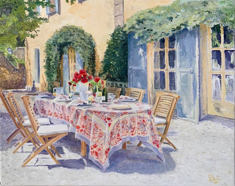 Impressionist oil painting of a beautiful French courtyard setting where we are just waiting for the guests to arrive. The striking red flowers are complemented by the various green surroundings. The floral tablecloth adds an interesting element and color scheme. Painted with a light texture the pie...