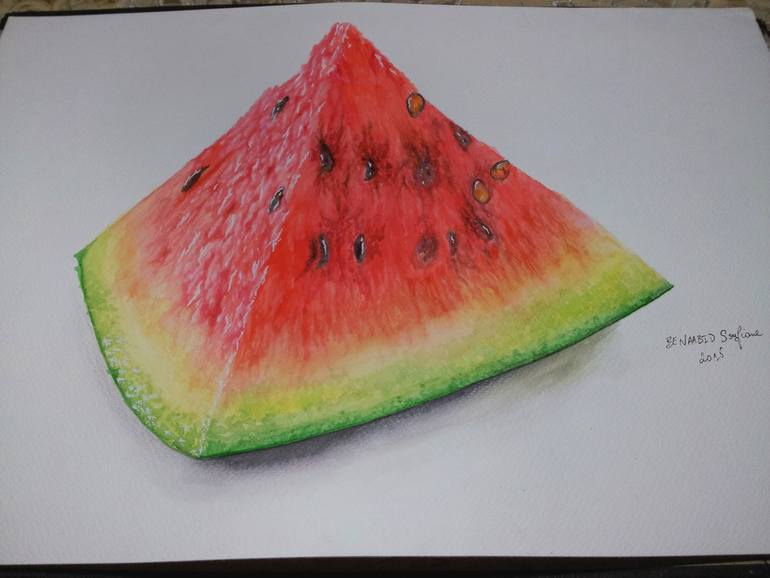 "In this captivating artwork, I have crafted a hyper-realistic and 3D representation of a watermelon using the enchanting mediums of watercolor and watercolor pencils. Drawing inspiration from two colors that resonate deeply with me – vibrant red and soothing green – I merged these hues to bring for...