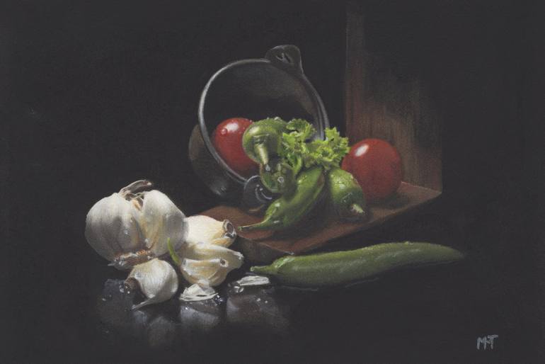 Fresh vegetables painted on Arches Hot Pressed paper ( = 100% cotton ) with watercolour on a black background in gouache The painting is double archival museum quality matted in a black aluminium frame. The total size with frame is 7,87 inch ( 20 cm ) x 9,84 inch ( 25 cm )