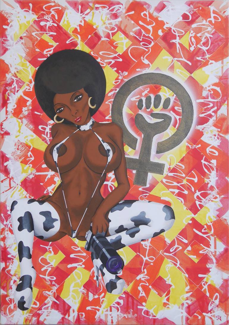 Sexy, heroic black women characters from popular culture against multiple layers inspired by tapa barkcloth patterns and asemic primal scripts.