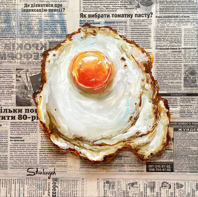 DETAILS about artwork: * Name: Fried Egg * Painter: Julia Stankevych * Size: 16 x 16" (40x40 cm) * Original handmade oil painting * Style: Realism, Art Deco * Materials: hardboard, newspaper * Signed by artist * NO FRAME